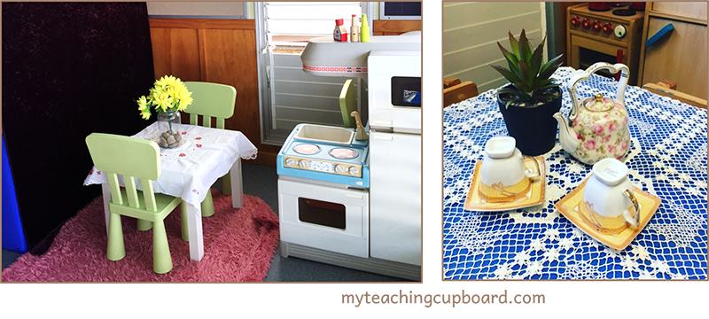 Dramatic Play Home corner – a couple of texts about families, play kitchen, cutlery, plates & saucepans, small table & chairs, toy food, telephone and telephone numbers, play clock, vase of flowers, cookbook, tablecloth, play fridge, shelf.