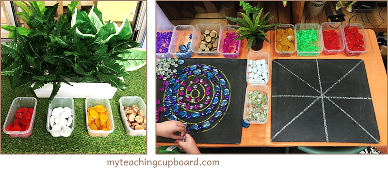 Add pattern mats and sorting bowls for sorting or creating designs with loose parts. Download these resources from my Loose Parts Store Category.