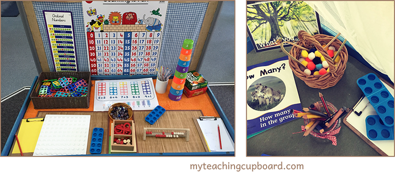 Maths: Counting text, finger and counting rhymes on cards, number poster, Calendar, wooden numerals, small selection of concrete objects (counters, teddy bears, bundling sticks, unifix), board game, dice, numbered cups.