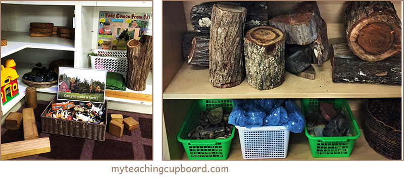 Blocks Area: text about animals & living things, big wooden blocks, basket of wooden people, basket of animals, small fake grass squares, a few small pieces of fabric, pinecones, big wooden dice.